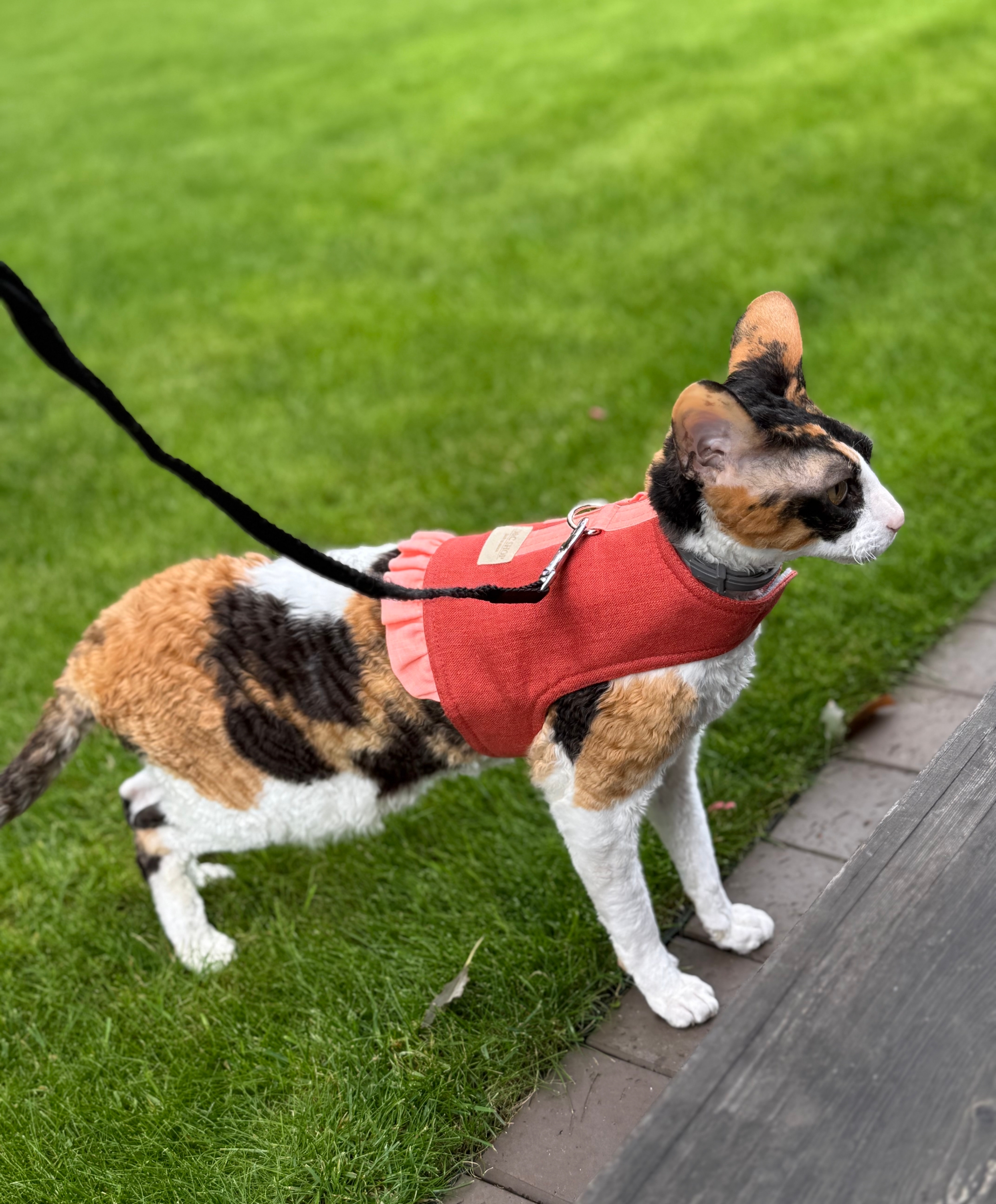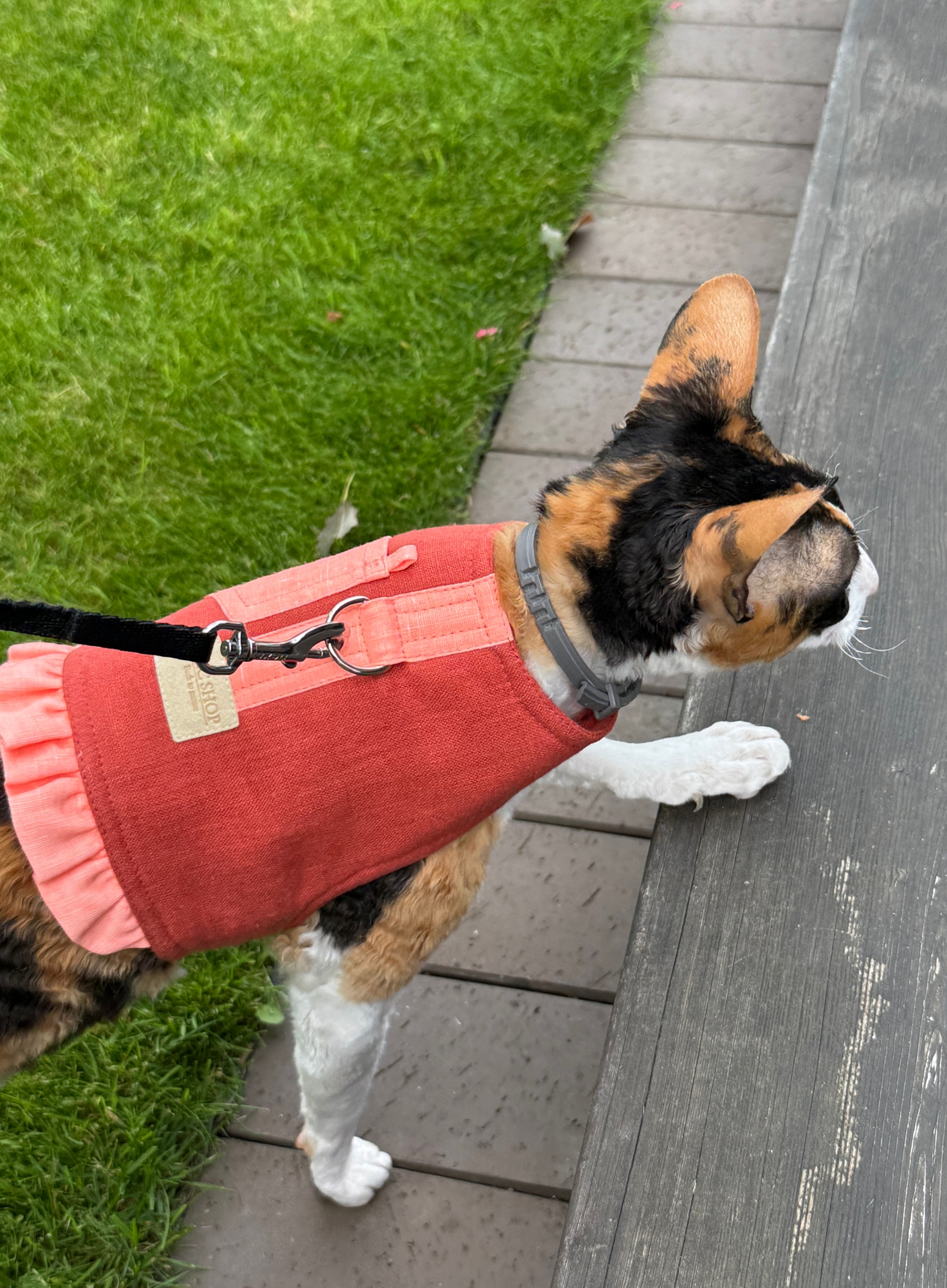Pagamintas iš dviejų sluoksnių lininio audinio su plona vilna viduje, todėl liemenė pralaidi orui, tinkama naudoti net vasarą.  Jūsų katinukas jausis patogiai.