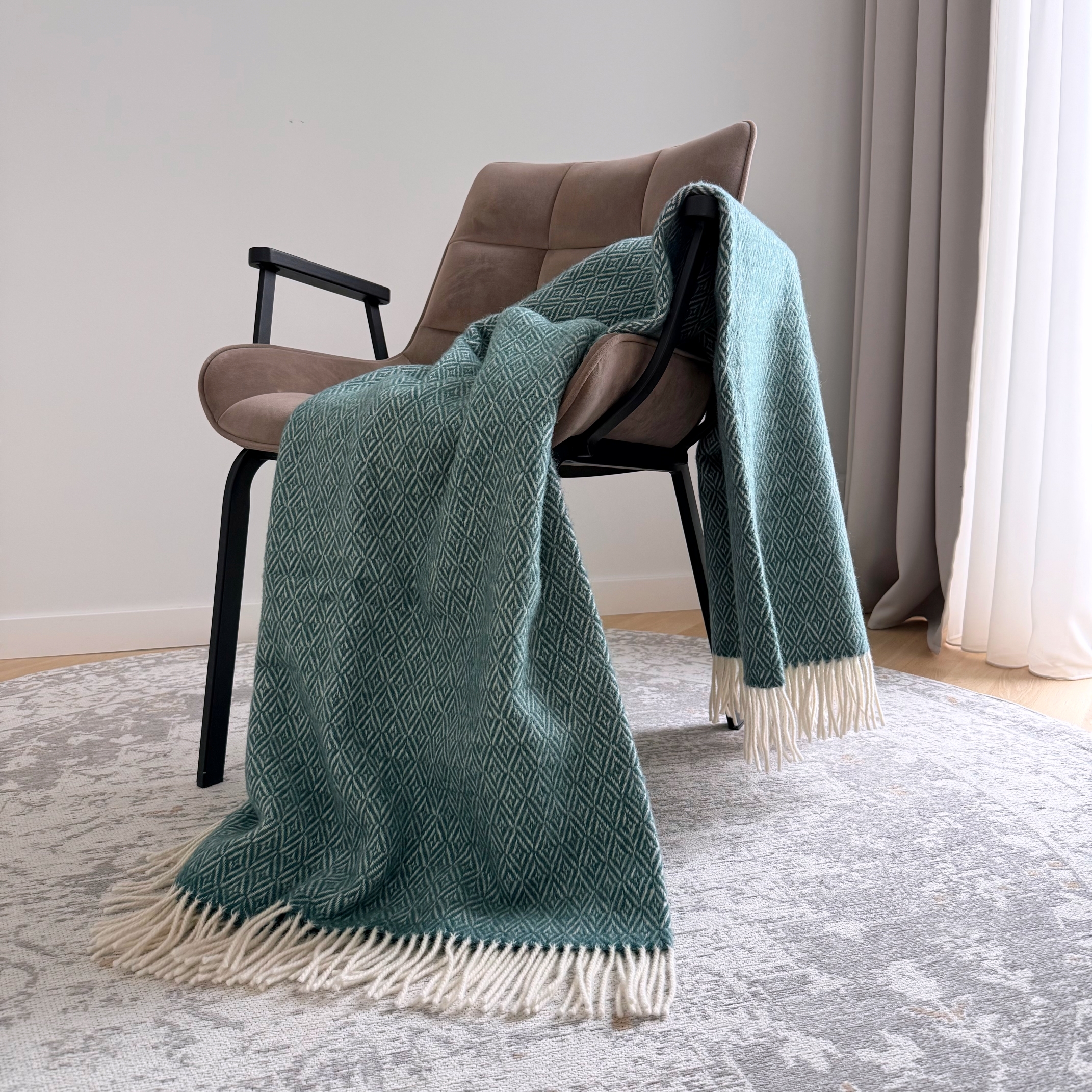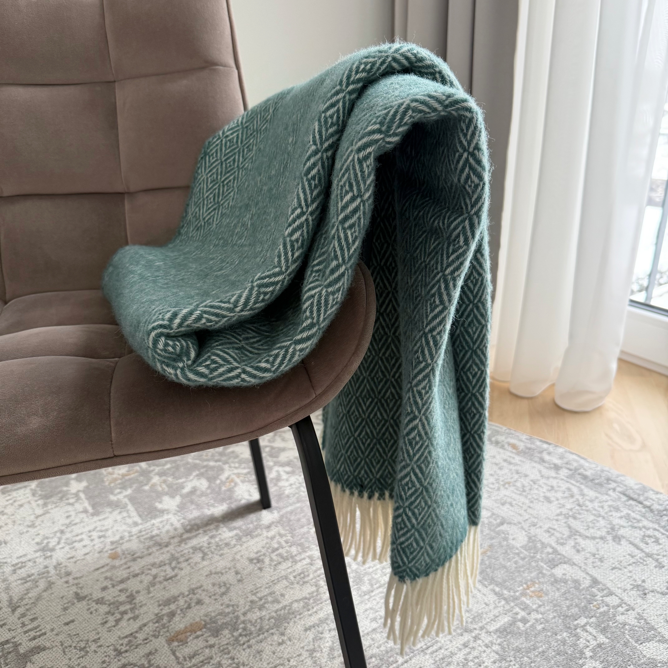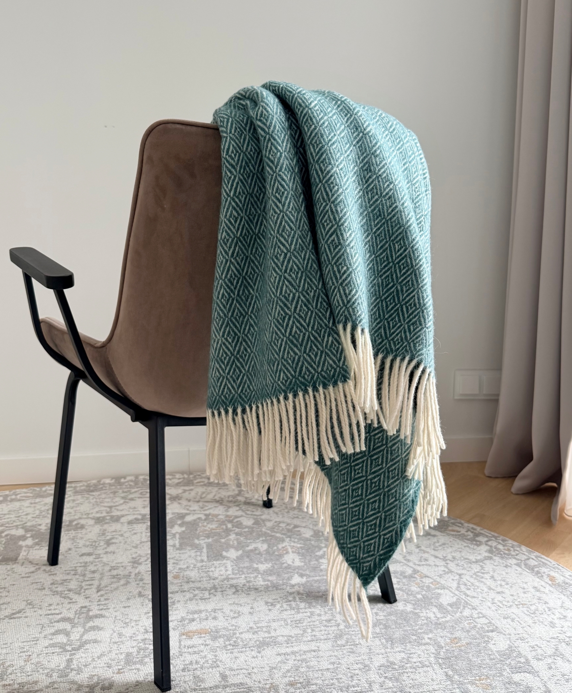 Pledas minkštas, šiltas, lengvas. Dviejuose galuose pledą puošia kutai. Savo raštu puikiai tiks skandinaviško stiliaus interjerui ar pagyvins neutralų minimalistinį stilių.