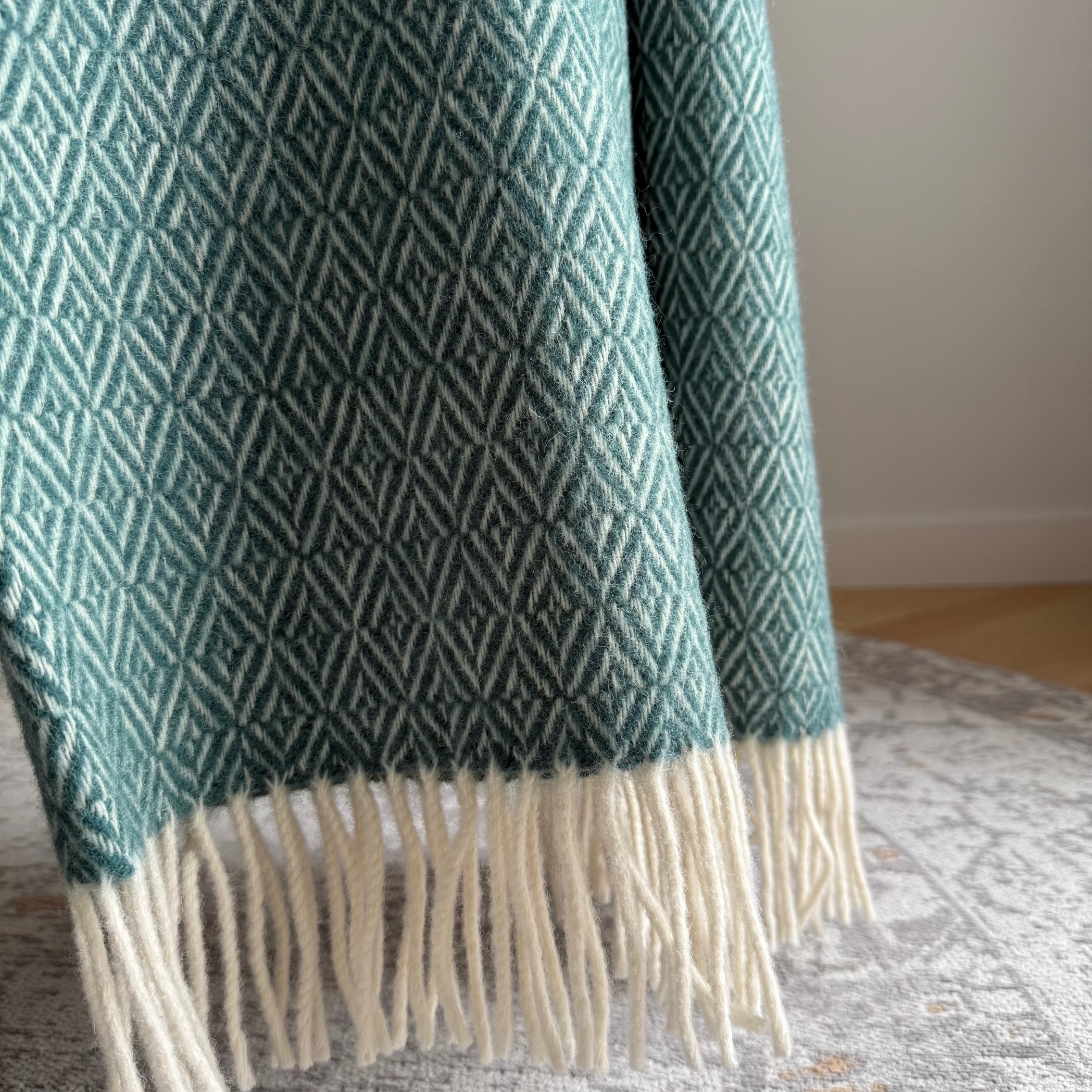 Vilnonis pledas, austas smulkių rombų raštu iš žaliai mėlynos ir baltos spalvos verpalų.
