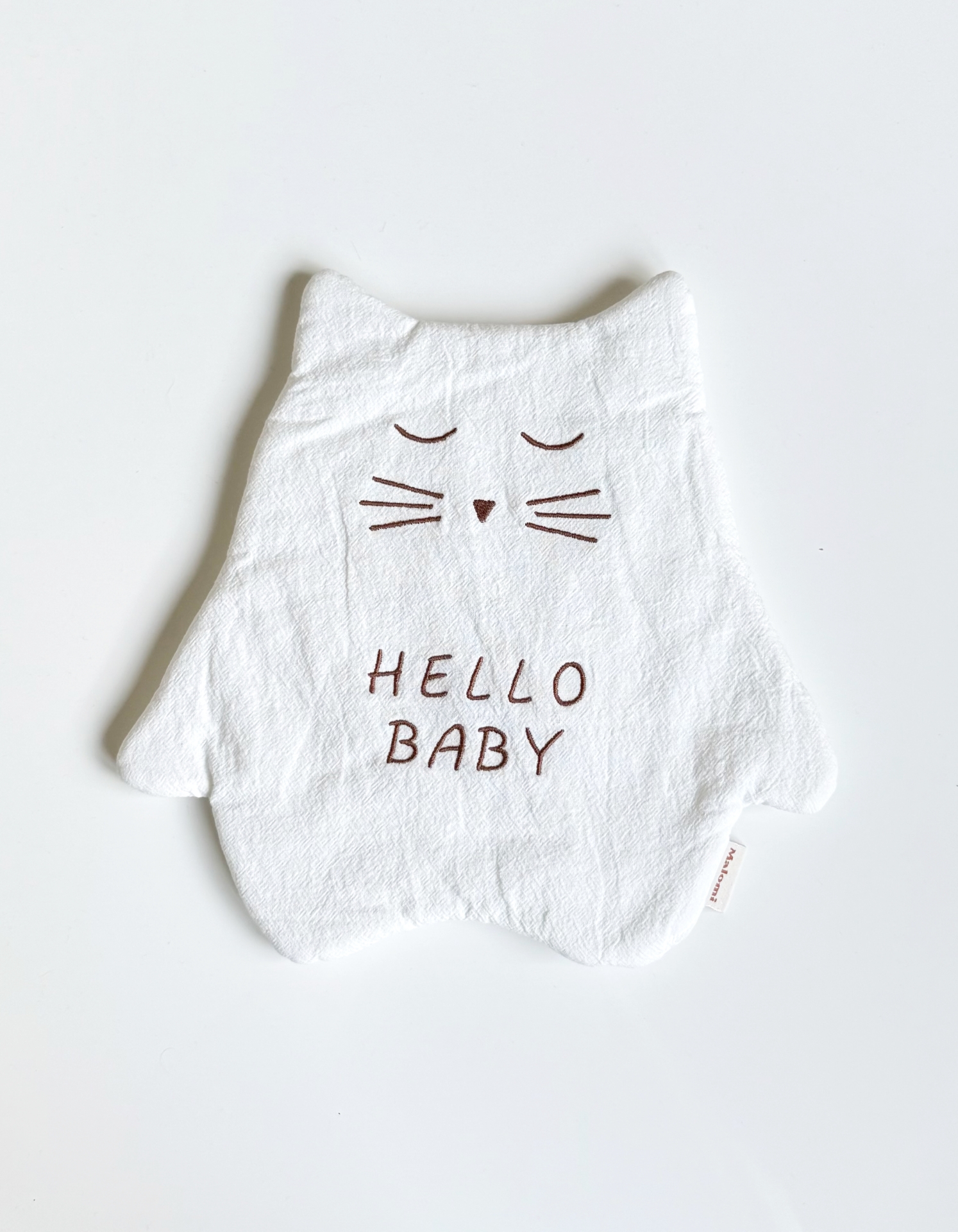 Minkštas, skalbtos medvilnės migdukas, pirmasis žaisliukas kūdikiui- kačiukas. Pieno spalvos, su siuvinėtomis detalėmis.